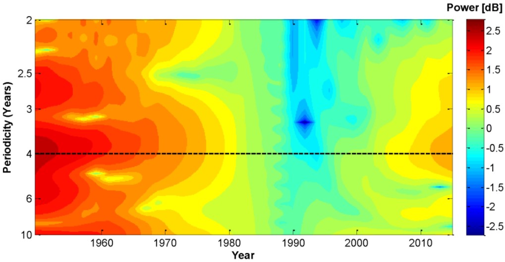 בתמונה: מפת חום המתארת את עוצמת המחזוריות בתחלואת שעלת לאורך השנים. ניתן לראות שאותה מחזוריות ארבע שנתית שנצפתה בשנות החמישים (טרם תקופת חיסוני השעלת), חוזרת ומתעצמת בשנים האחרונות.